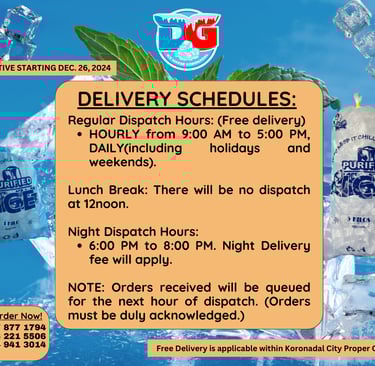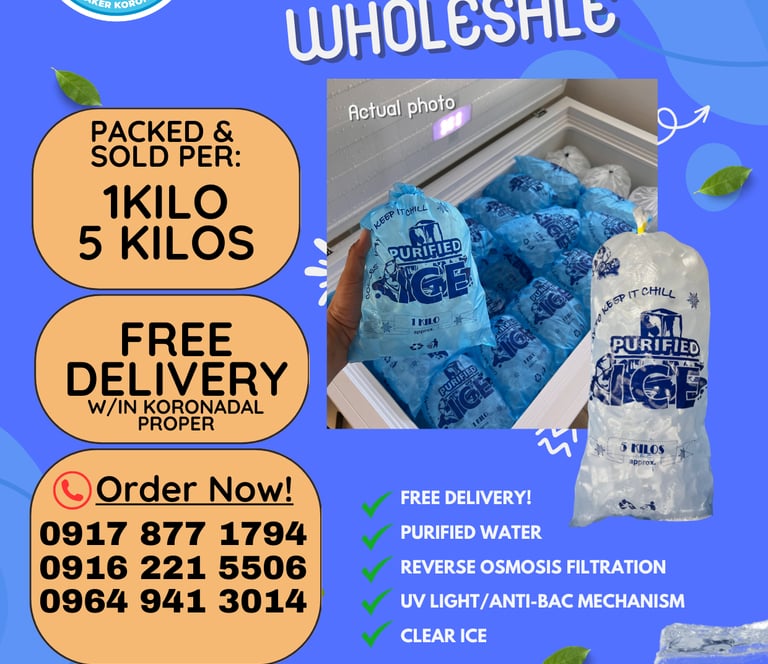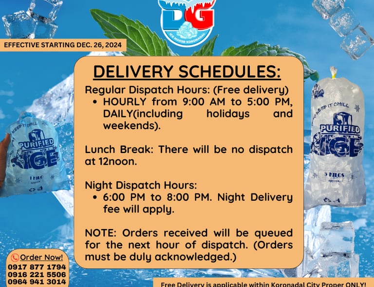 Enjoy free delivery within Koronadal for all your ice needs and orders. FREE DELIVERY WITHIN CITY OF KORONADAL PROPER.